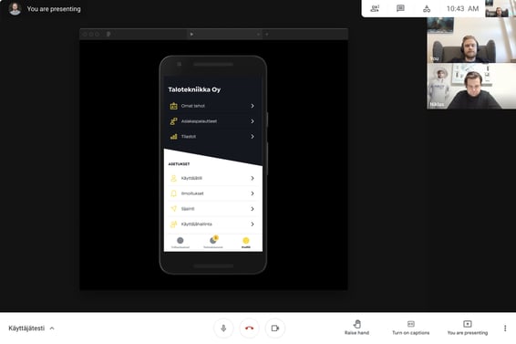 - Käyttäjä voi avata Figma-prototyypin puhelimensa Internet-selaimessa, ja fasilitoija voi seurata käyttäjän liikkumista protossa reaaliaikaisesti tietokoneellaan Figman Presentation View -tilassa. Fasilitoija voi taas jakaa tämän omalta ruudultaan videopuhelussa, jolloin sekä ääni, video, että käyttäjän liikkuminen protossa saadaan nauhalle.