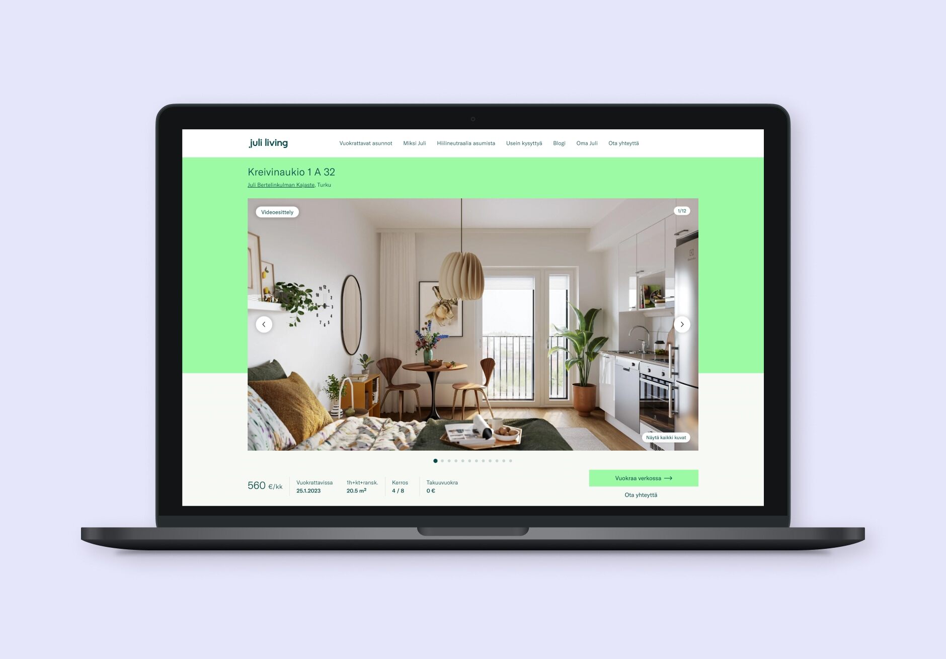 Juli Living toimii asuntojen verkkokauppana, joka on aina saatavilla. Asiakkailta on poistettu prosessista turhautumista aiheuttava odottaminen. Digitaalinen vuokrausprosessi tarjoaa tyylikkään ja helpon tavan vuokrata asunto jopa vartissa suoraan verkon kautta.