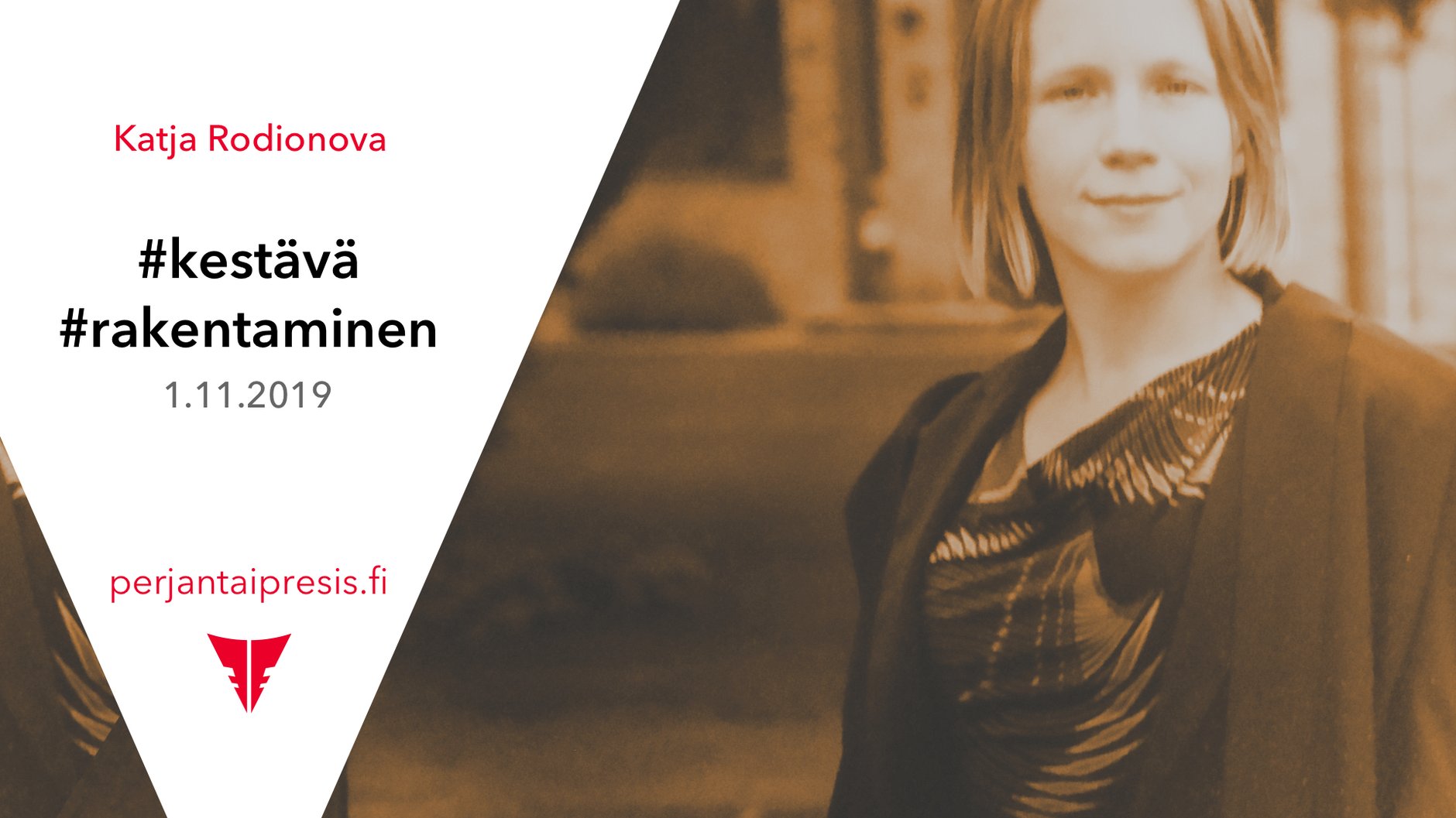 Kestävä rakentaminen on tulevaisuuden kannalta välttämätöntä. Edessä on uusia haasteita urbanisaation ja ilmastonmuutoksen muodossa, eikä näitä voida ratkoa enää perinteisin keinoin. Tällä viikolla (1.11.2019) perjantaipresiksessä Katja Rodionova kertoo meille kestävän rakentamisen haasteista sekä talojen kokonaissuunnittelusta. Mitä se oikein on ja miten digitaalinen teknologia sopii siihen paremmin kuin tavanomaiseen suunnitteluun? Katja lupasi myös kertoa muutaman sanan puutalojen ihmeellisestä maailmasta digitaalisen kaksosen näkökulmasta.